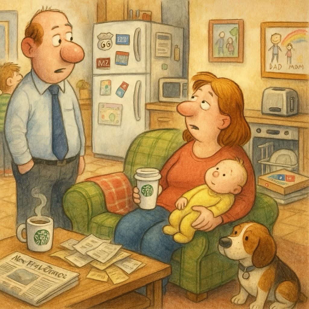 H: She runs errands, pays bills, grabs groceries, sometimes has to go back out if she forgot something. Then she feeds the baby, changes more diapers, puts the baby down for a nap, cleans the kitchen, starts laundry, tidies the house… you know, because she “doesn’t work.”